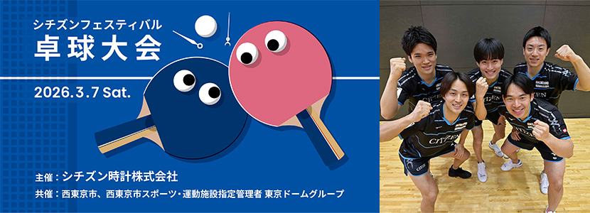 毎年開催しているシチズンフェスティバル卓球大会は、子どもから大人まで楽しめる大会として、多くの方にご来場いただいています。今回も卓球を楽しんでいただきたいと、下記の通りシチズン時計(株)の本社のある西東京市で開催します。